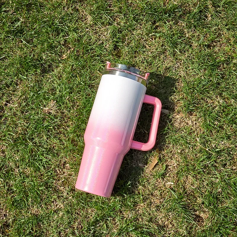 Turn every sip into a little celebration. This 40oz glitter shimmer holographic rainbow tumbler doesn’t just hold your drink – it reflects your style. With a generous capacity, comfortable handle, and eye-catching rainbow finish ready for sublimation customization, it’s the perfect everyday companion for the car, office, gym, or home.