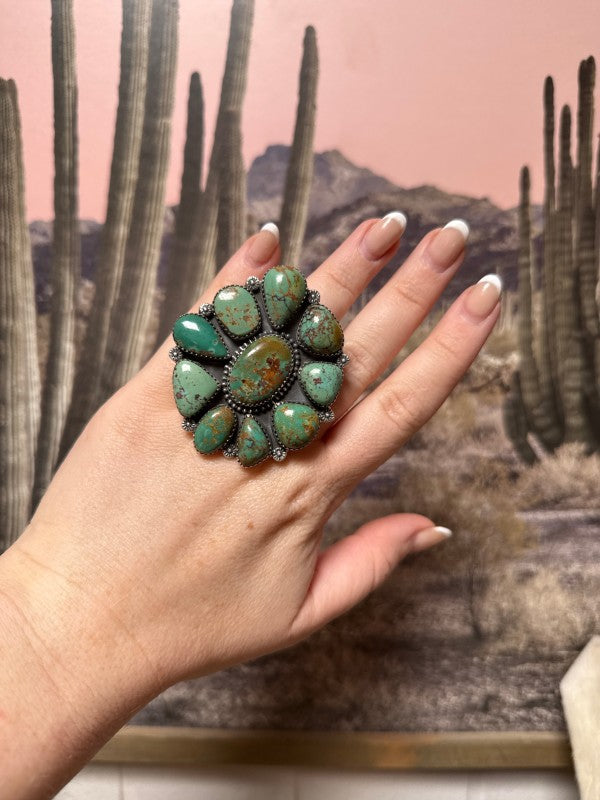This is a beautiful handmade Royston Turquoise and Sterling Silver Adjustable Square Ring. Ring measures 2 1/4 inch x 2 inch wide . Signed Nizhoni and stamped sterling. So beautiful!