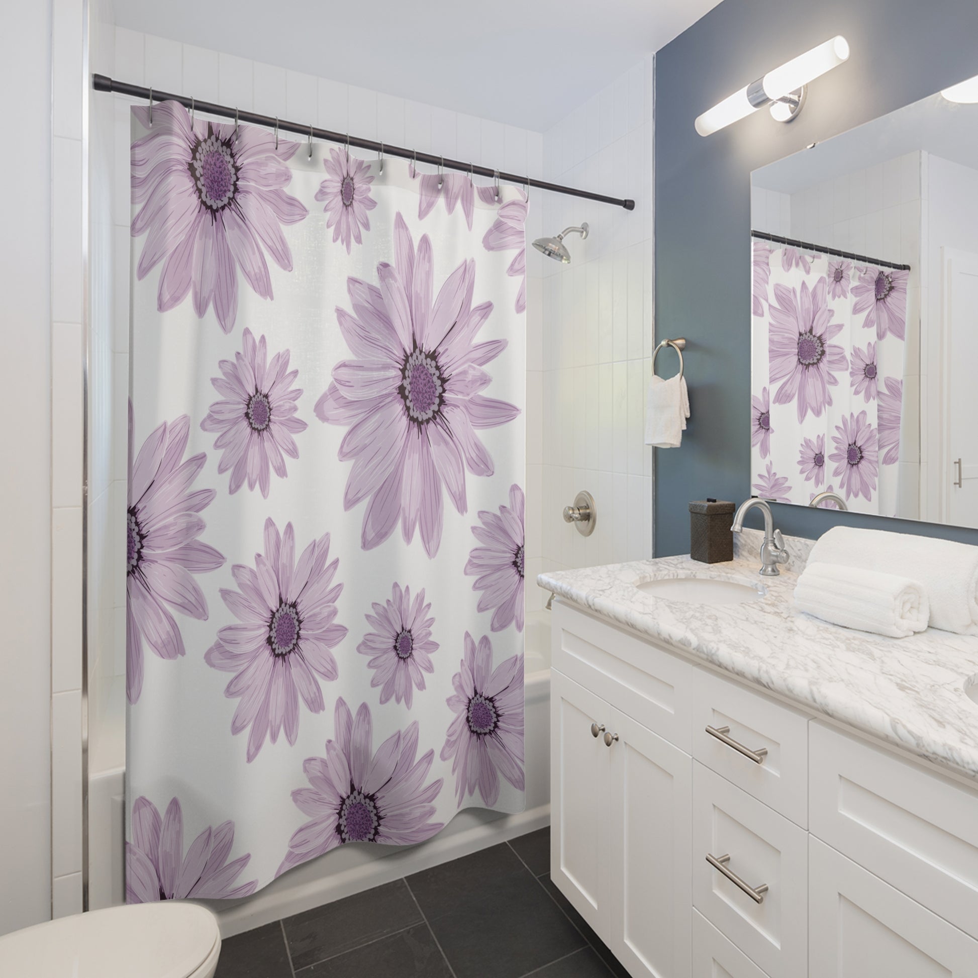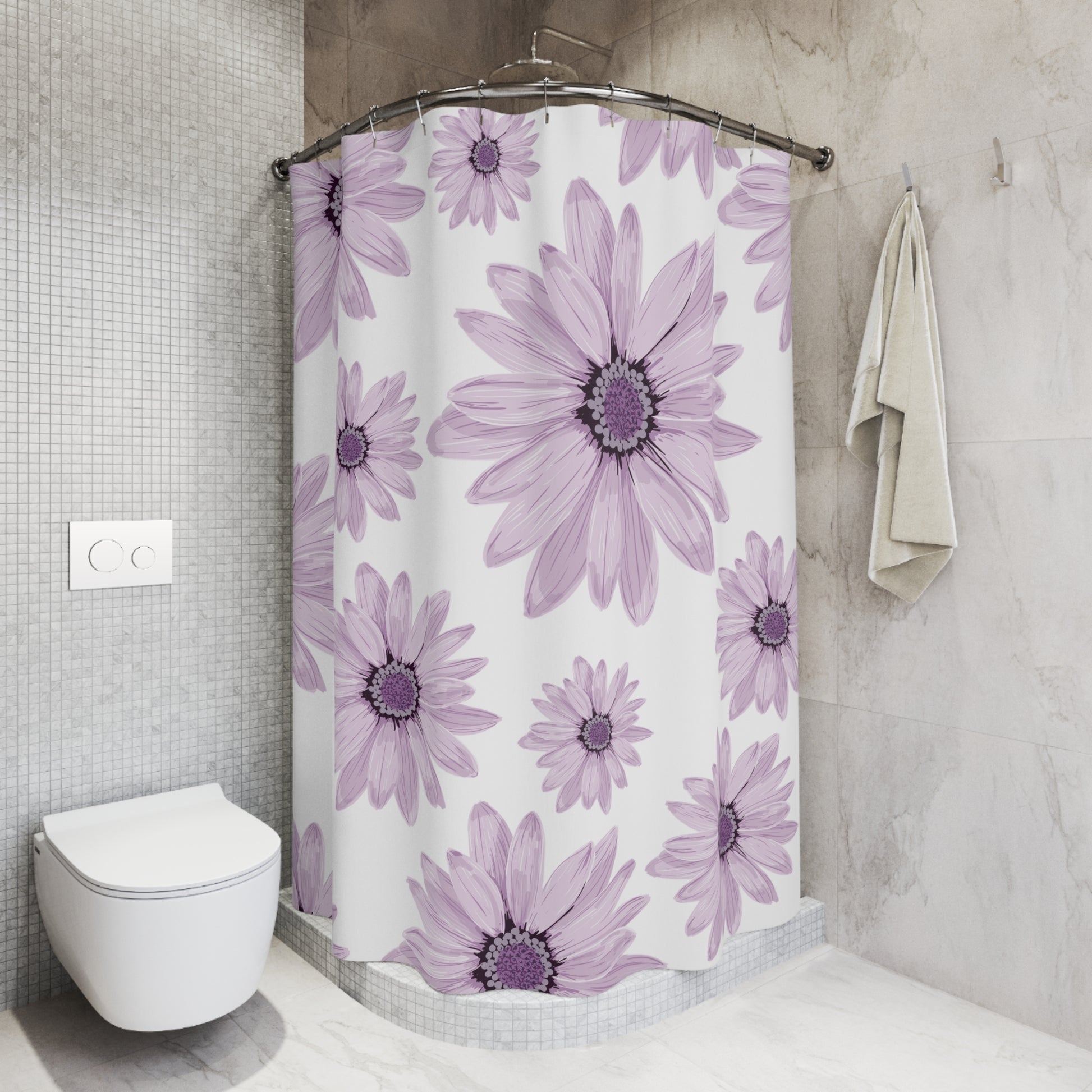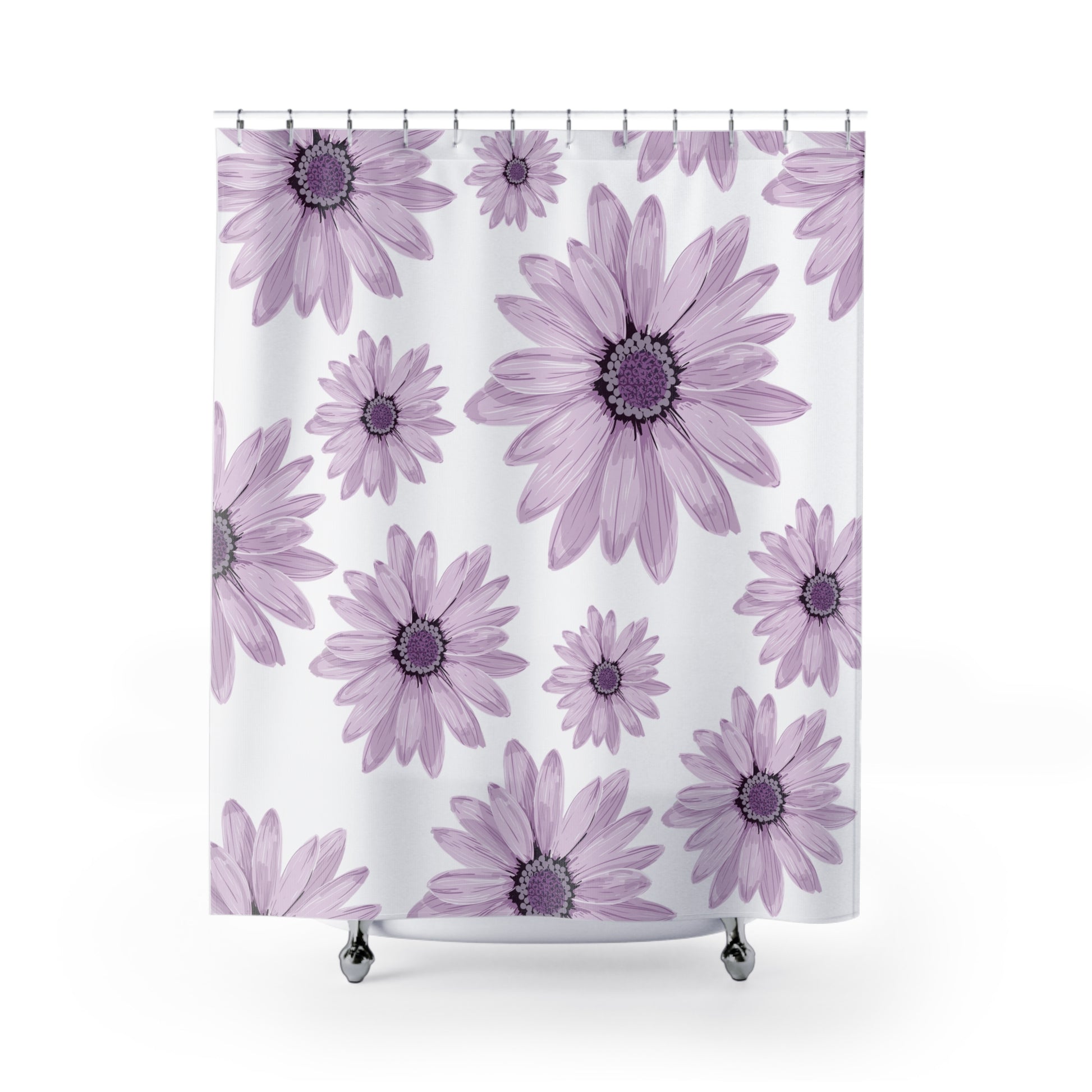 Transform your bathroom into a serene sanctuary with our beautifully designed shower curtain. Featuring a stunning pattern of delicate purple daisies, this shower curtain infuses your space with tranquility and natural charm. Ideal for those who love floral aesthetics, it creates a calming atmosphere perfect for start or end of the day rituals. Whether you're updating your home decor or gifting to a friend, it's an excellent choice for housewarming parties, spring decor, or Mother's Day celebrations. This shower curtain is not only stylish but is also practical, making it suitable for adults looking to enhance their bath experience.