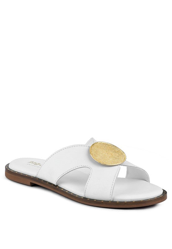 The metal embellishment enhances the overall aesthetic of the leather slip-on sandals. The tiny studs along the insole frame give it a lovely finish. The cushion insoles offer comfort while the X cut-out detail is visually appealing. They are easy to wear and look chic and fashionable.