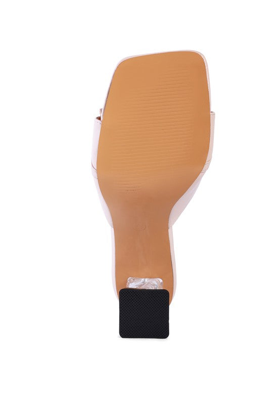 Clear Heel detail sandal with ruched straps and rhinestone details looks gorgeous. The comfortable mid-high heels are perfect for brunches and casual occasions - come with soft padded lining which cuts strain.