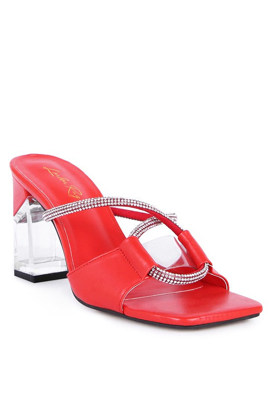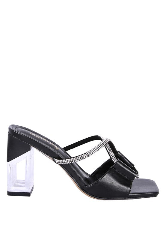 Square toe mid heel slides with crystalline loop strap. The mid-heel slide sandal has a clear block heel and looks stylish. Has comfortable height and complements all summer looks.