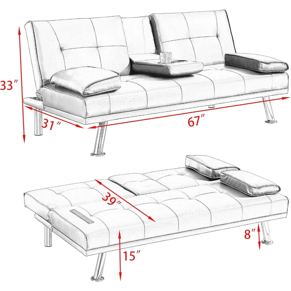 This versatile faux leather sofa bed is a space-saving solution that transforms from a loveseat to a full sleeper in seconds, perfect for small spaces like apartments, studios, or home offices. It offers three reclining positions for ultimate comfort, whether you're working, watching TV, or napping. The sofa bed features removable armrests and built-in cup holders for added convenience, making it suitable for living rooms, dorm rooms, or cozy bedrooms. Constructed with durable materials, it boasts soft faux leather upholstery, sturdy metal legs, and a reinforced mid-foot for stability. High-density foam cushions ensure day-long comfort, and the scratch-resistant frame guarantees long-term use. Easy assembly is required, with no tools needed for the removable armrests. Ideal for hosting overnight guests, the fold-out bed feature and sleek modern design make it a versatile addition to any home, office, or rental property. The easy-to-clean faux leather also simplifies maintenance.
