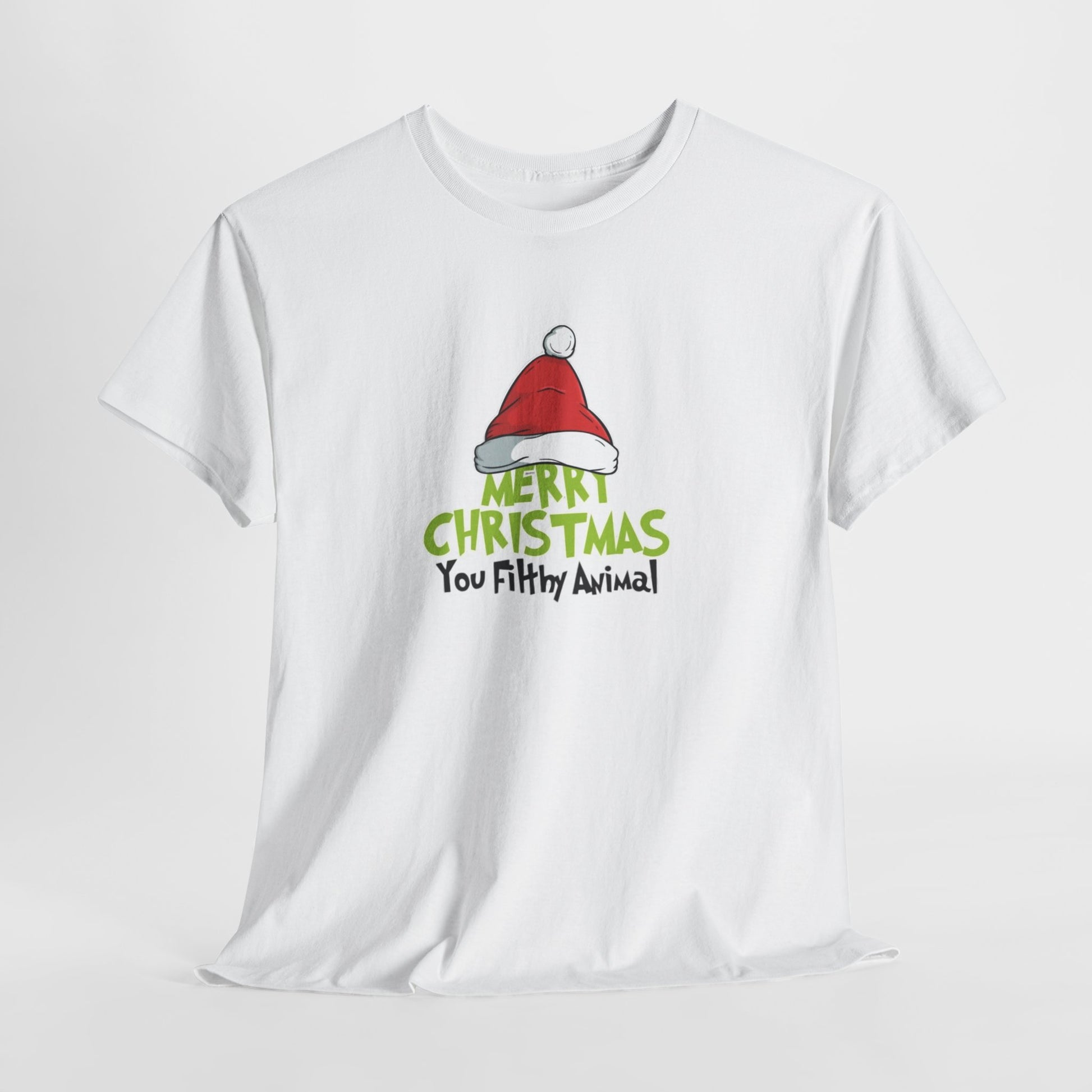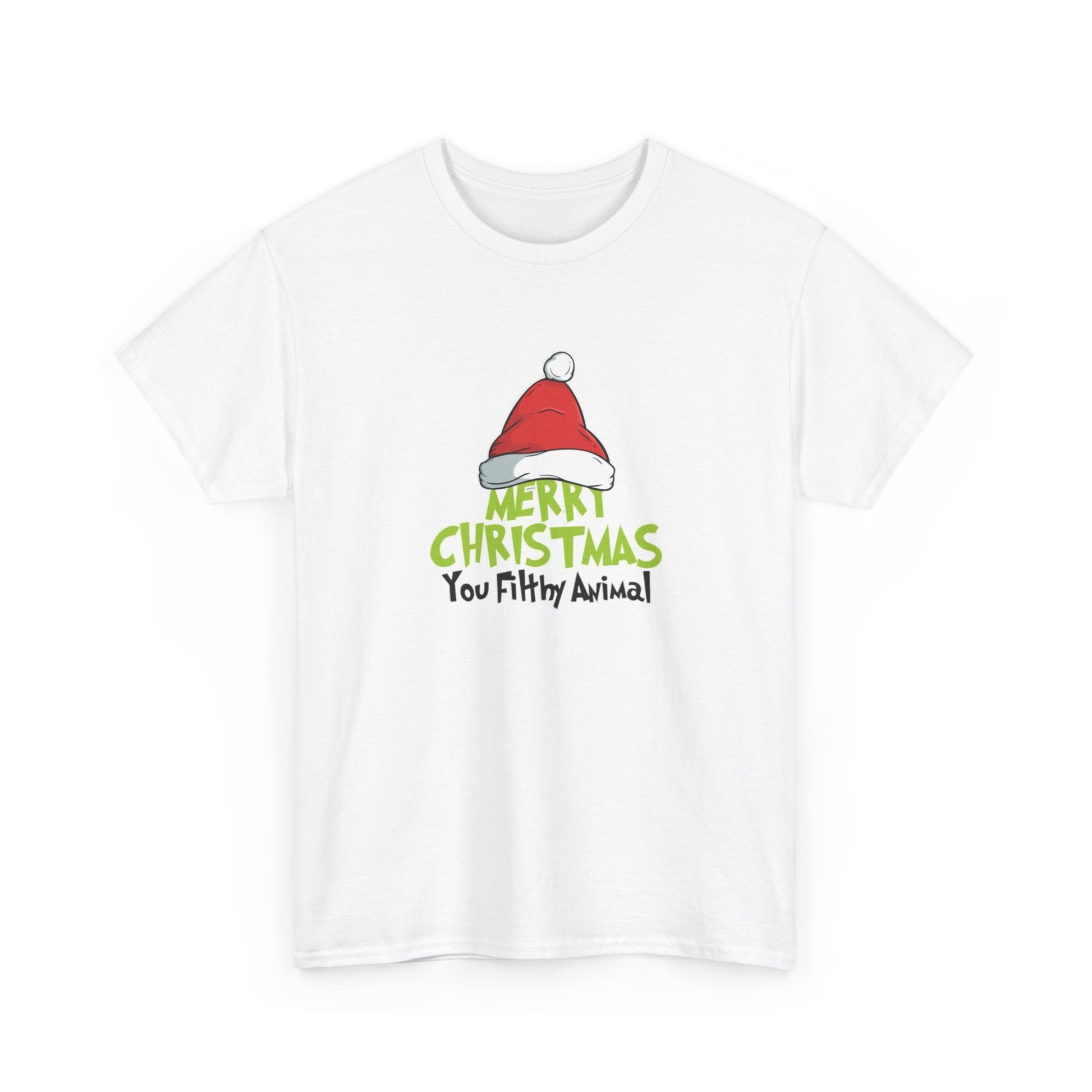 Spread holiday cheer with this festive tee featuring the funny phrase 'Merry Christmas You Filthy Animal'. Perfect for Christmas parties, gifting, and adding a touch of humor to the holiday season. Suitable for adults.