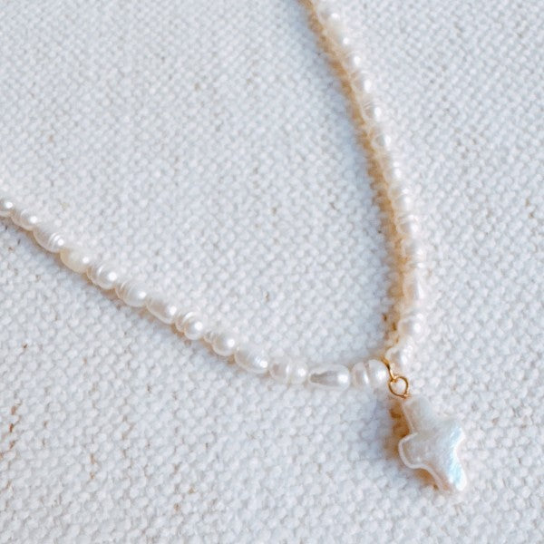 Enhance your attire with this elegant necklace. The beautiful genuine pearls add a touch of sophistication, while the lovely cross symbolizes faith and love. Elevate your style and spirituality with this exquisite necklace.