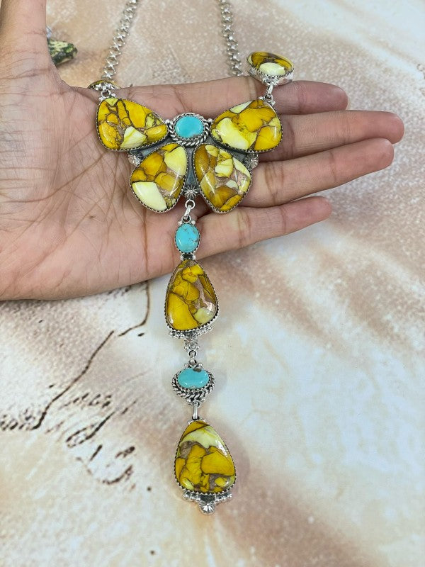 Beautiful Sterling Silver Honey Dahlia with Kingman Turquoise Necklace Measures length approximately 22 inches and width 2 3/8 inches with an additional drop of 5 5/8 inches.