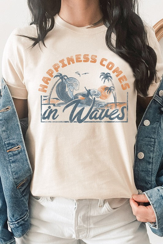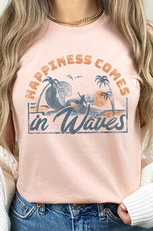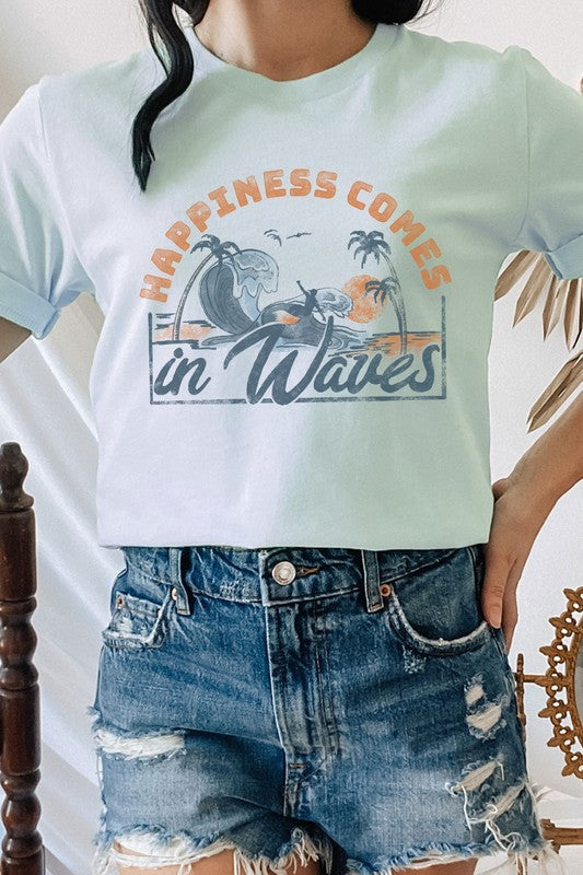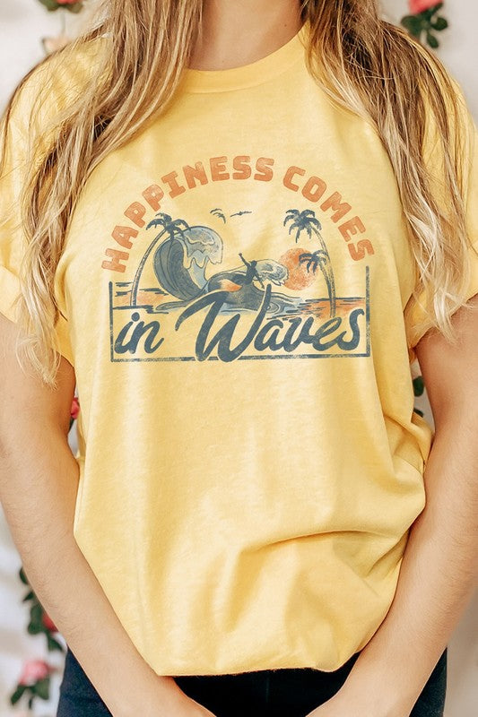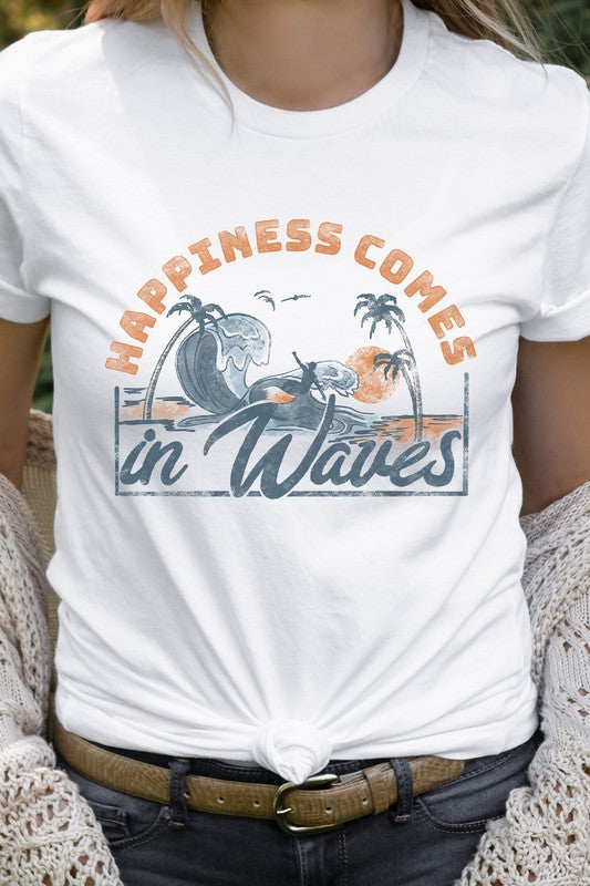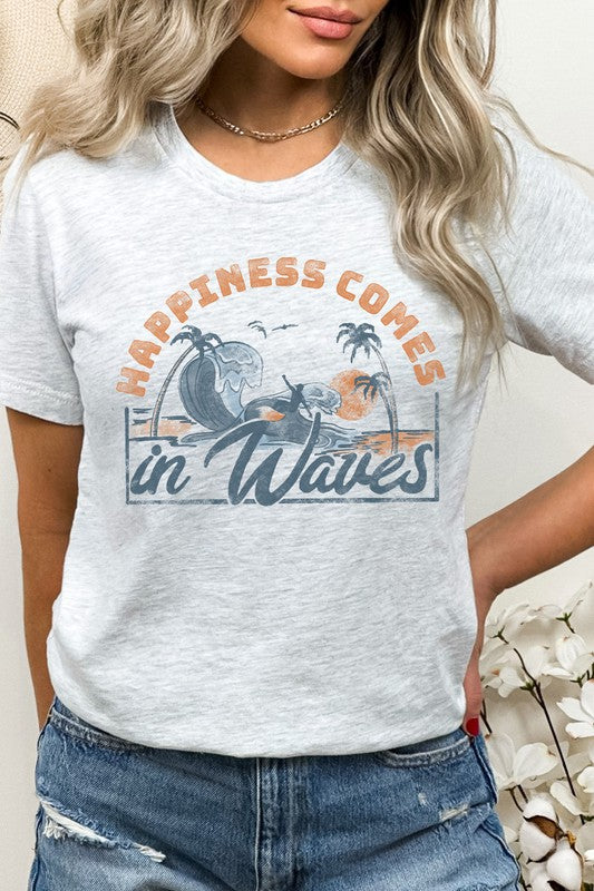 Get ready for the beach with this Happiness Comes In Waves Surf Beach Graphic Tee. Featuring a minimalist design with a wave graphic, this tee will make you feel the good vibes of the ocean. Pair this top with your favorite pair of denim jeans or shorts for a complete summer outfit. Most t shirt colors are 52/48 cotton/poly blend. White and Cream tees are 100% cotton, Ash tees are 99/1 cotton/poly.Get your surfboard and hit the waves with this stylish and trendy tee. By Kissed Apparel.