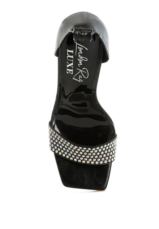 Indulge in luxury with these AB rhinestone-embellished heels, crafted from luxe, shiny fabric. Featuring an open square toe and a detachable lace-up detail, they're designed to impress. With plush cushioned insoles and striking 4-inch cut-out fantasy heels, they're the ultimate pair for your party and wedding collection.