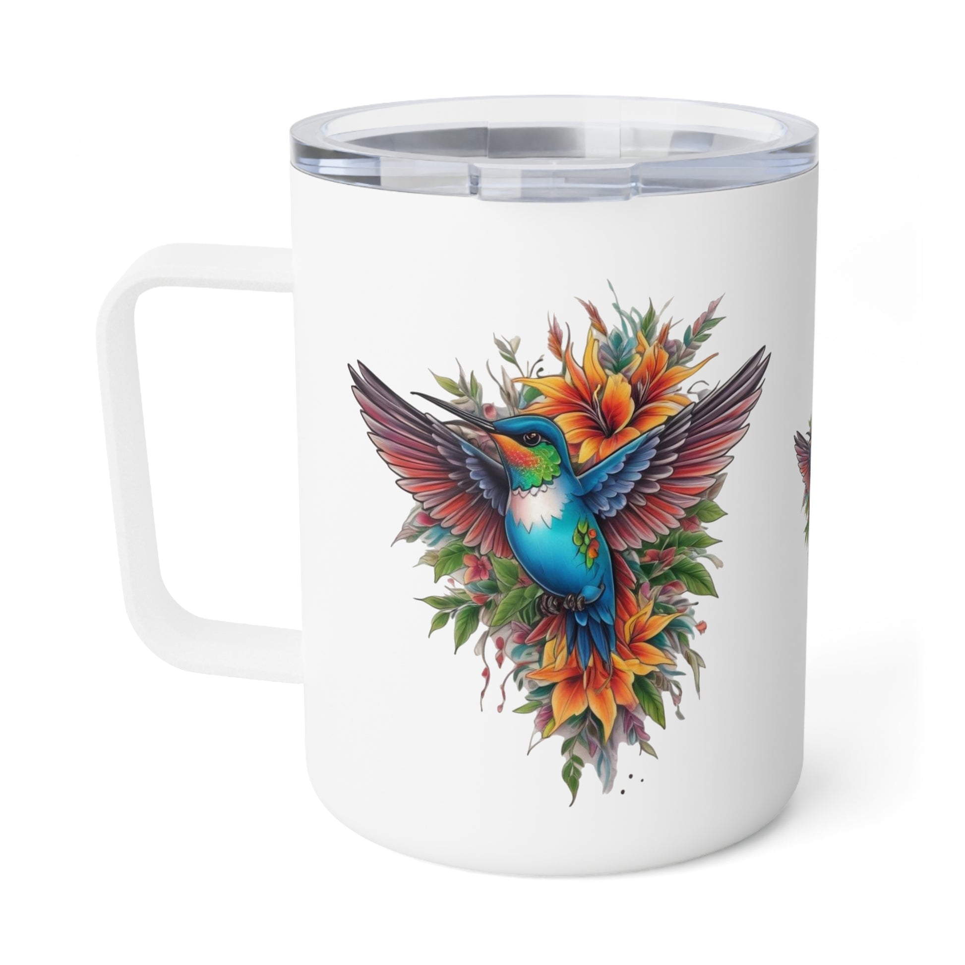This vibrant insulated coffee mug is designed to bring a burst of joy to your daily routine. Featuring a stunning hummingbird illustration surrounded by bright botanical elements, it evokes a feeling of liveliness and warmth. Perfect for coffee lovers and nature enthusiasts alike, this mug is ideal for those who enjoy savoring their favorite beverages at home or on the go. Whether you're starting your day with a hot coffee or winding down with a soothing tea, this mug adds a touch of elegance and personality to your daily rituals. It’s a perfect gift for birthdays, holidays, or special occasions, capturing the essence of bringing beauty into everyday moments.