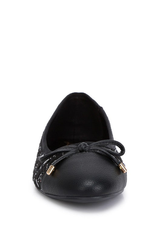 Take your ballet flats game up a notch with these chic and classic cut ballerinas with a faux leather toe cap that also adds intrigue to the eye and is right on trend. The bow embellishment elevates the overall look. The plaid print and tweed fabric are a classic ode to the Victorian era and look sublime and stylish.
