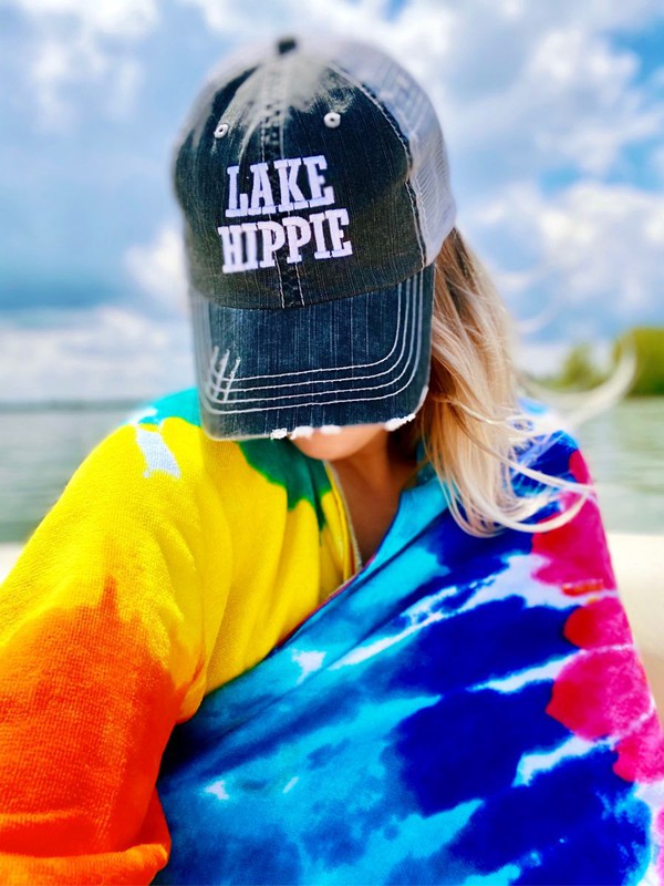 Lake Hippie Trucker hat with mesh back and velcro closing.