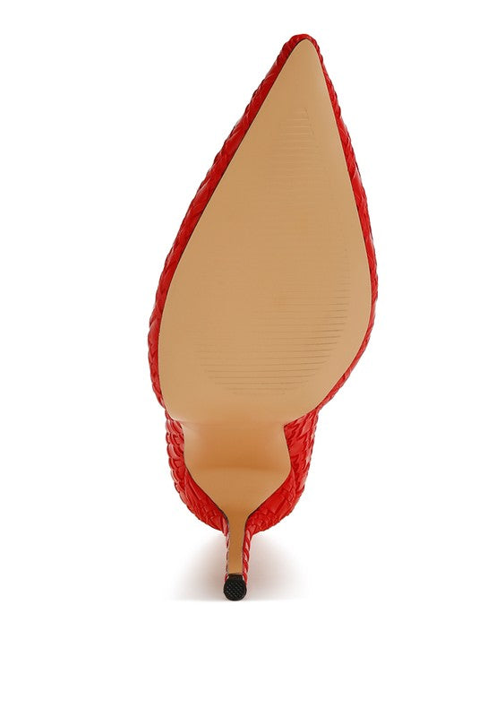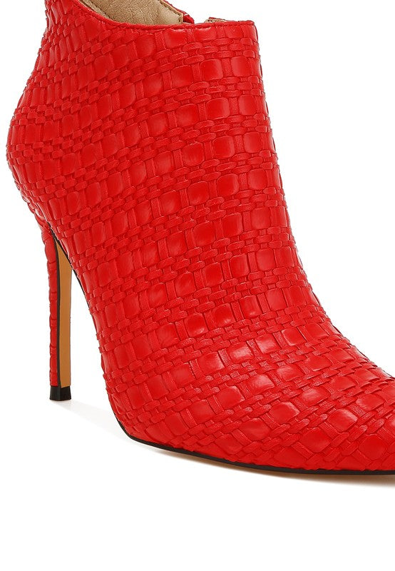 Concave Ankle Cut and pointed toe - this pair of stiletto boot has all the jazz which keeps winter look sharp. Crafted in woven textured leather, this dainty shoe has side zipper opening.