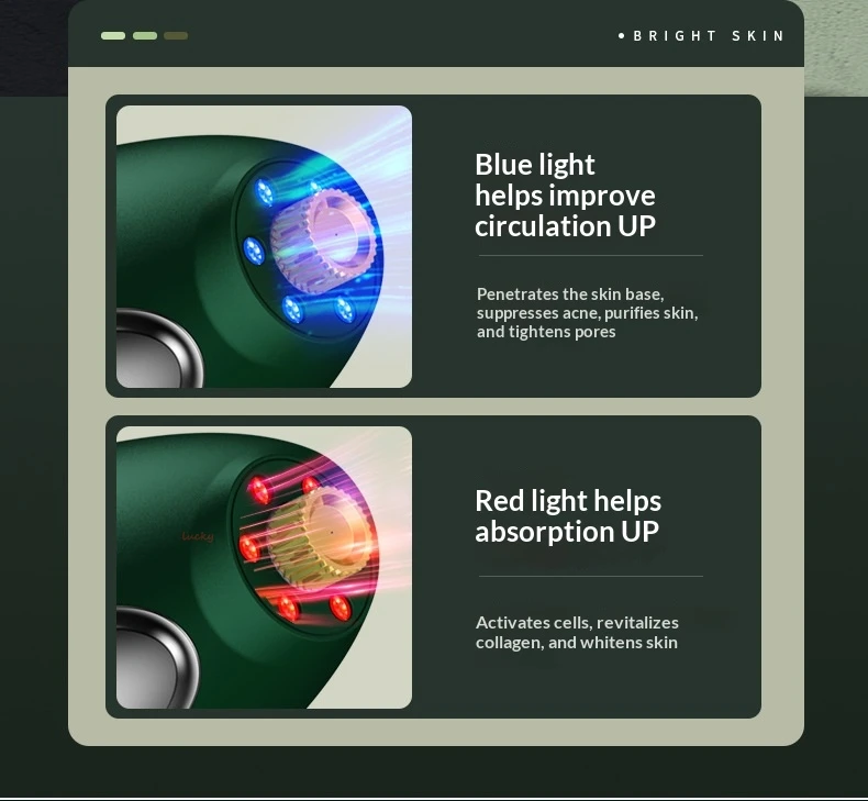 - Red & blue LED light therapy – Red light helps promote a smoother, more radiant-looking complexion, while blue light is ideal for calming and clarifying the appearance of problem skin.