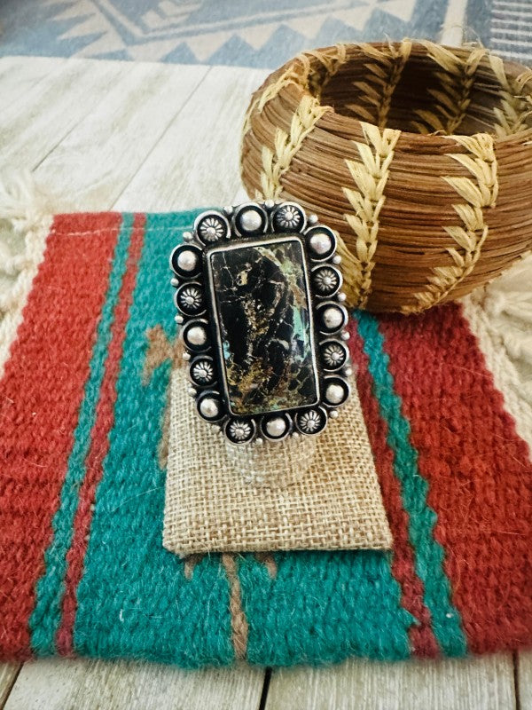 Gorgeous Navajo Sterling Silver and Blackjack Turquoise Ring. Size 7. Beautiful stone in this ring! Measuring 2 1/4 and 1 5/8 inches wide. Stamped Sterling and signed by the artist Jackson Hoskie