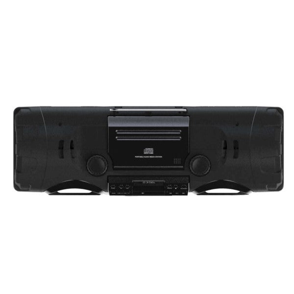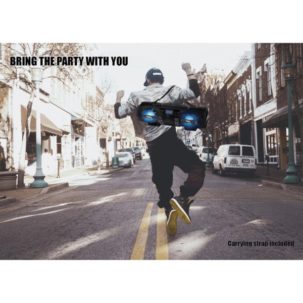 Get powerful, wall-to-wall sound with the Naxa NPB-262 MP3/CD Bass Boombox and PA System. This high-tech, classic boombox features BT technology and delivers bass you can feel with two microphone connectors. Its sleek, black design with a sturdy carry top strap adds convenient style to almost any audio setup. The Naxa reflex boombox lets you stream music from the AM/FM radio or smartphones and other BT-enabled devices. The player supports CD, CD-R/RW, and MP3 formats and has built-in MP3 playback from USB flash drives. The portable boombox with BT can be used as a powerful PA system and amp with two 6.3mm connectors for microphones or guitars, 3.5mm aux input, and a remote.