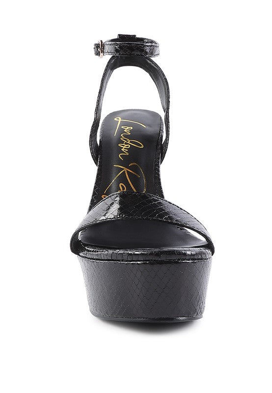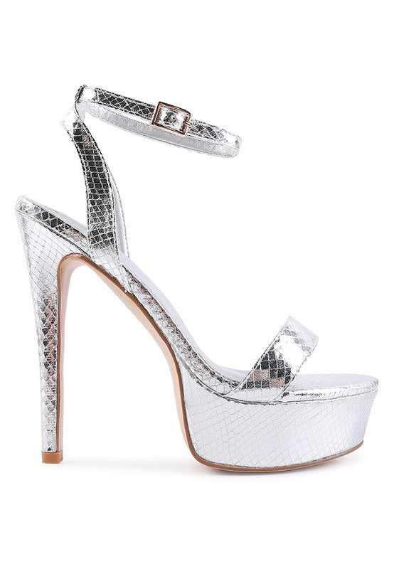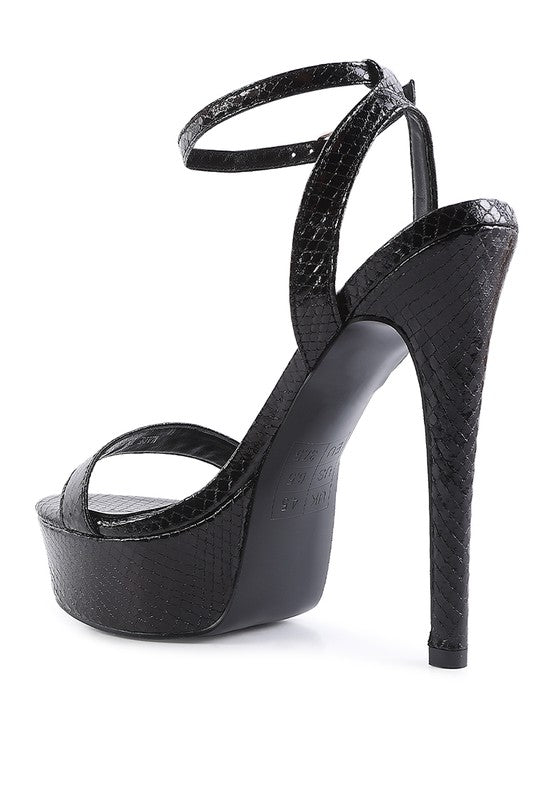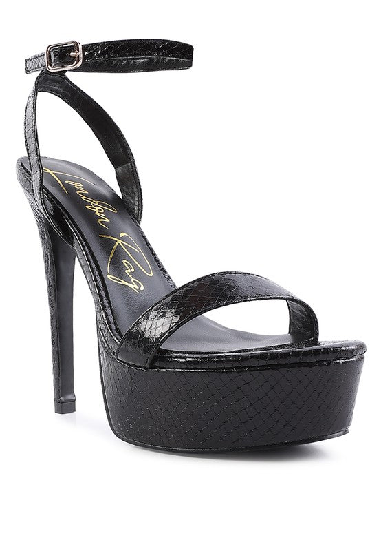 Turn heads in the women's Queen Bee High Heeled Sandals in black, gold and silver—platform stilettos studded with rhinestones, luxe croc texture, and sky-high glam for unforgettable nights. Bold high platform and heeled sandals made with croc textured faux leather. It holds well back with a thin pin buckle fastening on ankle straps. The sandals are sexy and chic. The soft cushion inner sole offers comfort to the feet.