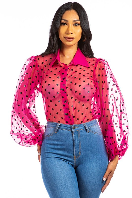 Sexy fuchsia pink see through mesh shirt, long belt sleeves, front button for women.
