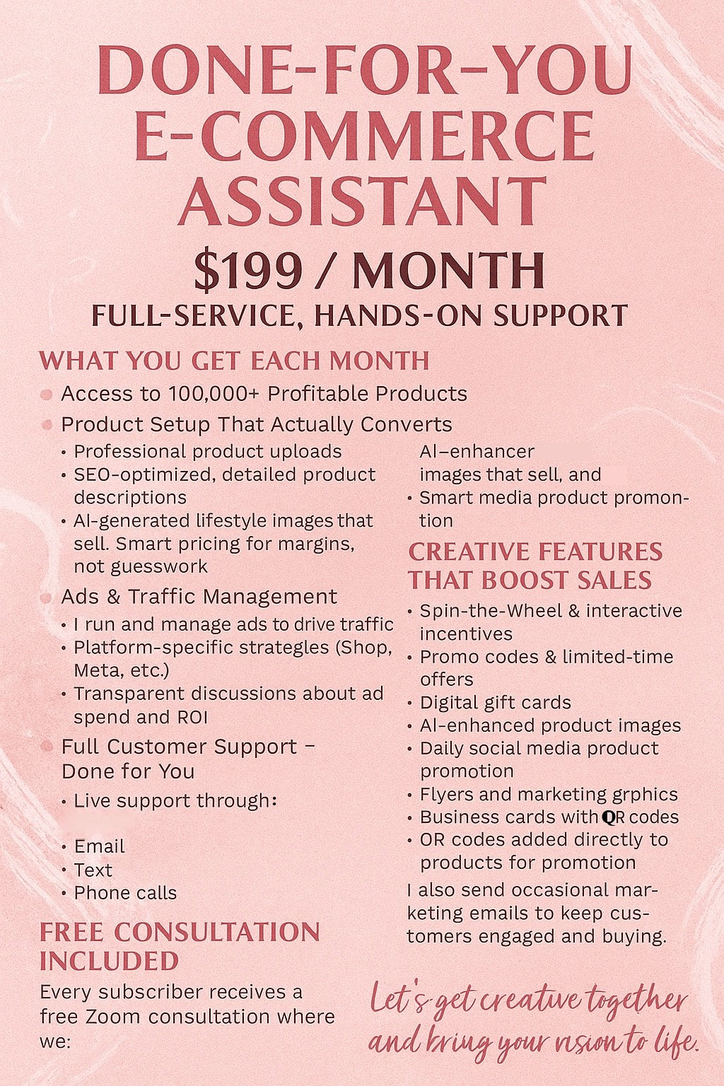 I don’t just “set up stores” — I design experiences. Every store is customized to reflect your brand, audience, and goals. We’ll collaborate closely to bring your vision to life in a way that feels authentic, beautiful, and functional.