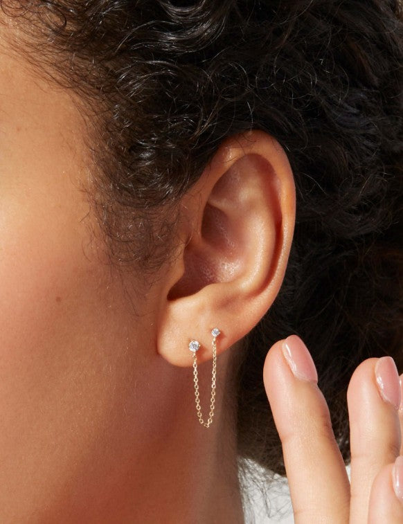 A minimalist 3-piece set featuring two crystal stud earrings and a double piercing chain earring. Clean, modern, and perfect for creating an elevated ear stack.