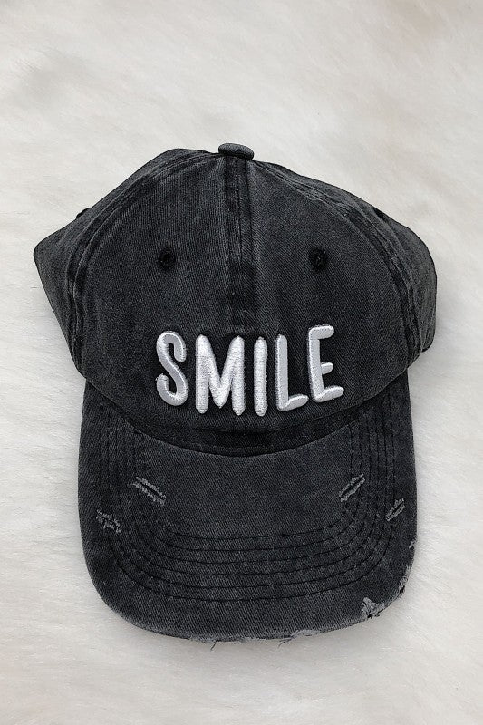 Let's smile and be happy with the cutest \"SMILE\" hat. Neutral dark gray distressed baseball cap with white embroidery on the front. Features a curved bill and is finished with an adjustable strap at the back. This hat is perfect for summer!