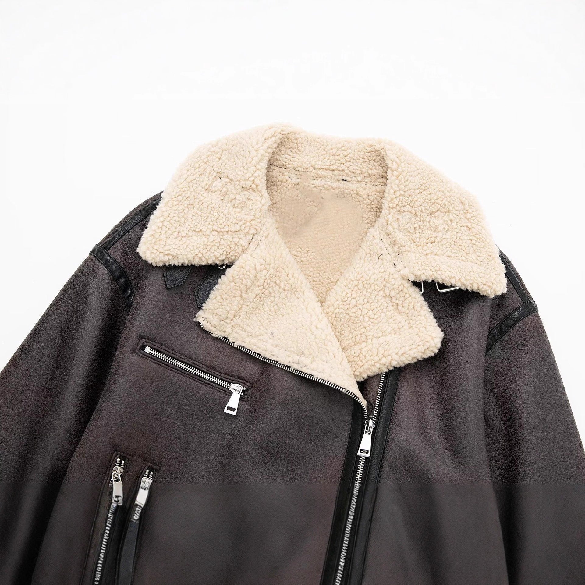 Stand up collar long sleeved patchwork fleece PU trench coat for women
