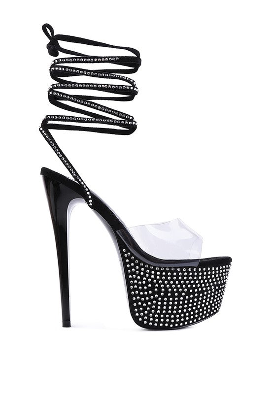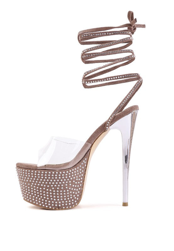 Centre of attraction guaranteed in these stunning and racy rhinestone platform heels. The strappy detail is sexy, while the diamante adorning the strap and the wedge is alluring. The strap is clear and hence the focus is completely on the heels.