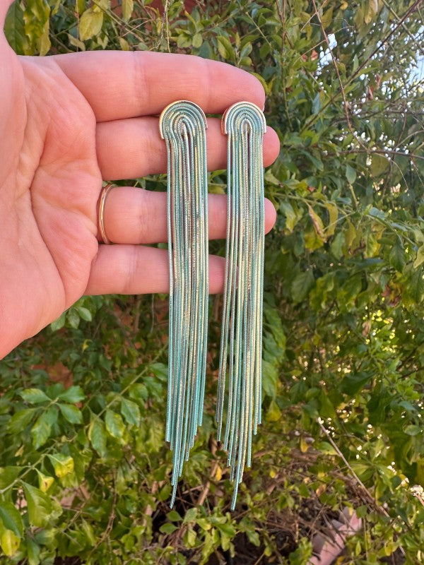 How gorgeous are these Handmade Turquoise & Gold Plated Tassel Drop Earrings. These are lightweight and measuring 6 inches long & 1/2 inch wide!