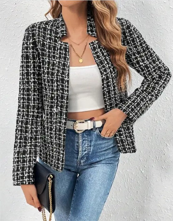 Channel timeless elegance with this chic tweed-style plaid jacket. Featuring a soft woven texture, structured shoulders, front button closure, and a tailored silhouette - perfect for layering over basics or elevating casual outfits.