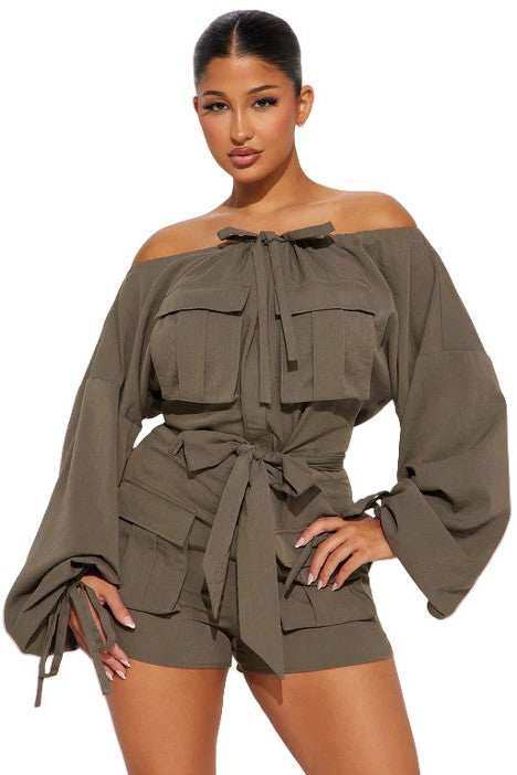 Women's fashion rompers, shoulder off, long sleeves, front pockets, cargo style look