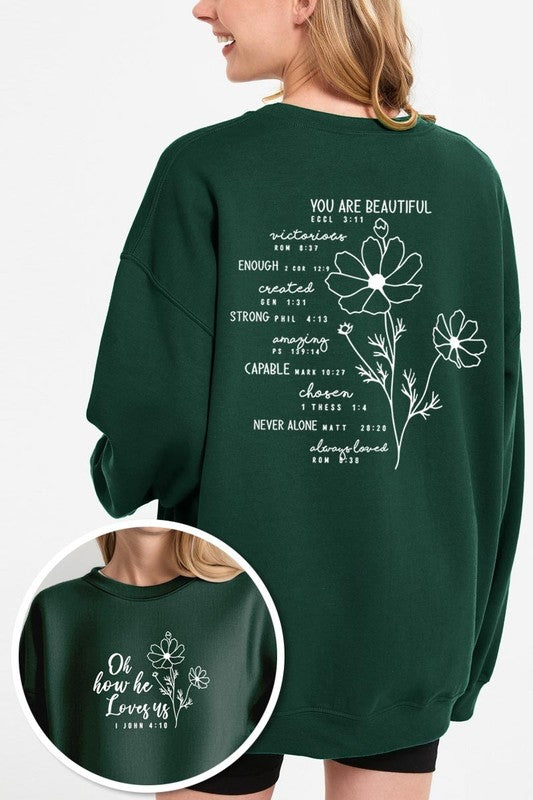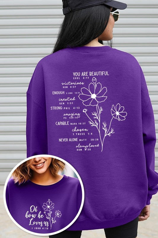 You Are Beautiful Front and Back Graphic Plus Sweatshirt. **PLUS SIZE**