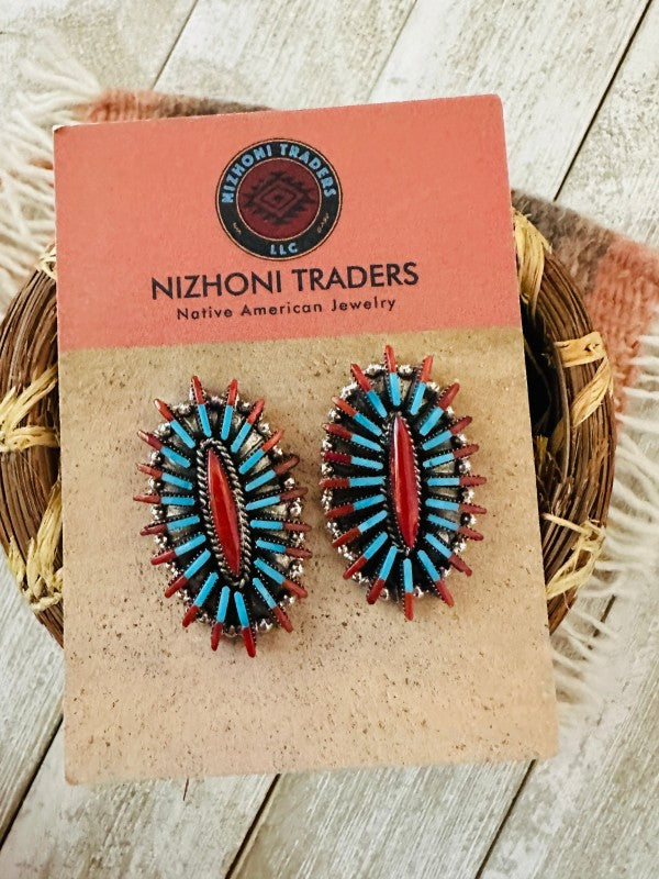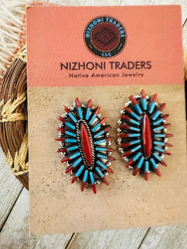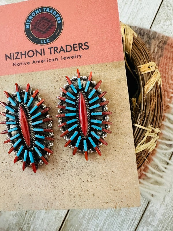Beautiful Zuni Coral Turquoise And Sterling Silver Needlepoint Earrings. Measuring 1 1/2 inches long and 7/8 of an inch wide. Signed by the artist and stamped Sterling. Such a pretty pair!