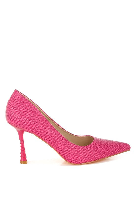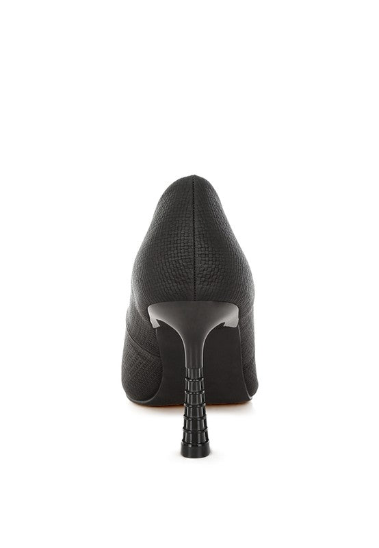 Experience luxury with these faux leather pumps featuring a classic pointy toe. Designed with a 3.5-inch textured stiletto heel, these pumps ensure comfort with their plush cushioned insoles. Perfectly paired with tailored trousers or mini skirts.